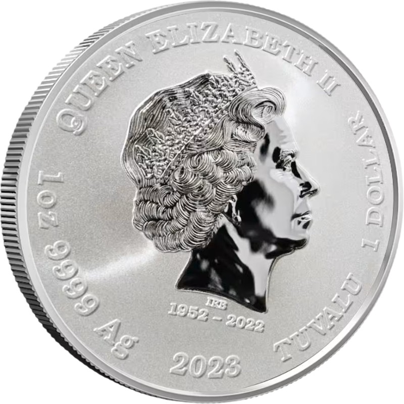 В центре монеты изображен портрет Её Величества Королевы Елизаветы II дизайнера Яна Рэнка-Бродли (IRB). Около портрета – 1952 - 2022 - годы правления. Вдоль канта по кругу надписи: QUEEN ELIZABETH II 1 DOLLAR  TUVALU 1 oz 9999 Ag 2023 (Королева Елизавета II, номинал, страна-эмитент, вес и проба серебра, год чеканки).