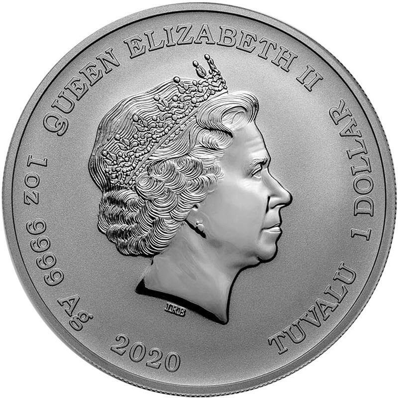 На аверсе изображена Ее Величество королева Елизавета II в бриллиантовой тиаре. Под портретом королевы выгравированы инициалы дизайнера IRB (Ian Rank Broadley). Вдоль канта надписи: QUEEN ELIZABETH II 1oz 9999 Ag 2020 TUVALU 1 DOLLAR (Королева Елизавета II, вес и проба серебра, год чеканки, страна-эмитент, номинал).