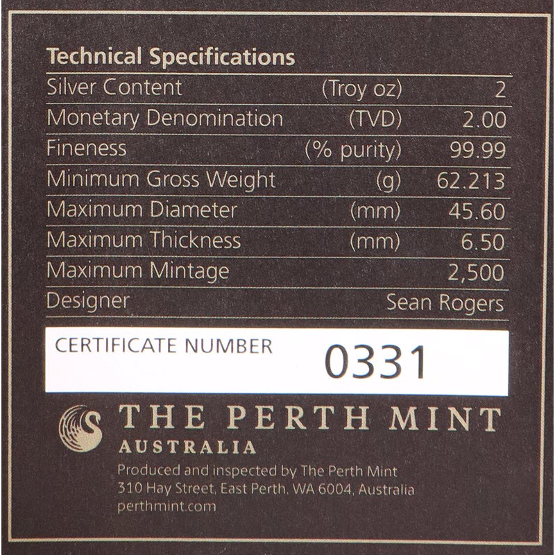 На аверсе изображена Ее Величество королева Елизавета II в бриллиантовой тиаре. Под портретом королевы инициалы дизайнера IRB (Ian Rank Broadley). Вдоль канта надпись: 2 oz 9999 Ag 2022 2 DOLLARS TUVALU QUEEN ELIZABETH II (вес и проба серебра, год чеканки, номинал, страна-эмитент, Королева Елизавета II).