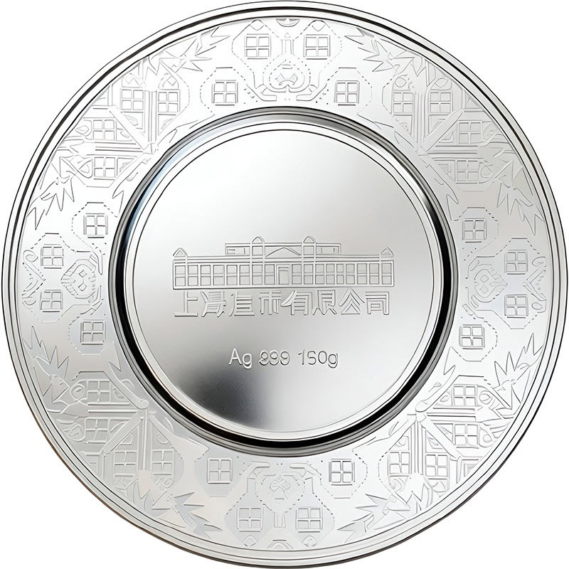 На аверсе изображено здание Шанхайского монетного двора. Внизу  надпись: Ag 999 150 g (вес и проба серебра). Вдоль канта узоры народа Цян.