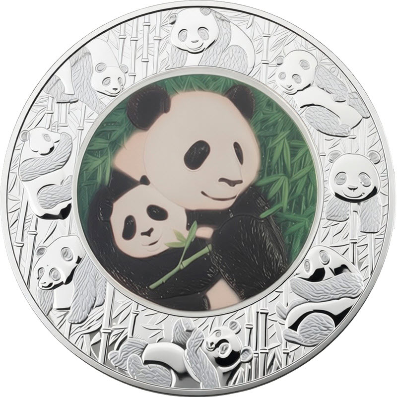 На реверсе изображены две панды в цвете, мама и детеныш. Вдоль канта узор из силуэтов панд на фоне бамбукового леса.