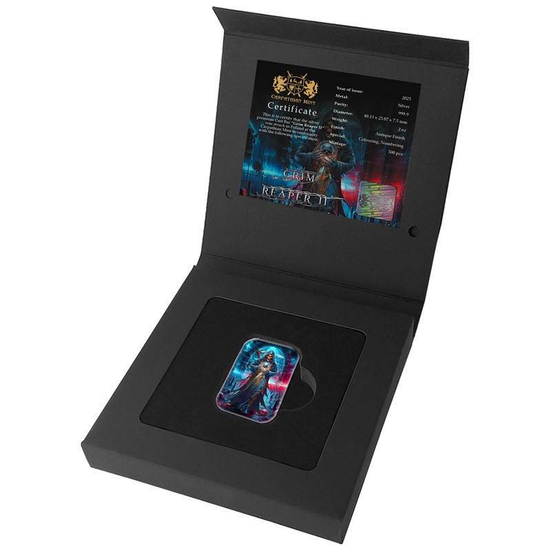 Этот серебряный жетон размером 40.13 x 25.07 x 7.5 мм от Carpathian Mint посвящен Жнецу. У него античное качество и селективная окраска. Поставляется в оригинальном футляре с сертификатом подлинности. Тираж: 500 штук.