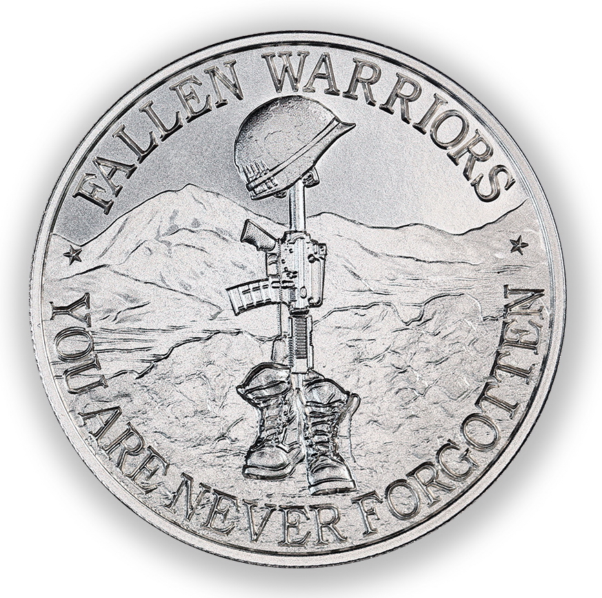 Серебряный жетон США «Крест Сражения» отчеканен частным американским монетным двором «Intaglio». Жетон посвящен символу павших воинов, который устанавливают на поле сражения; в данном случае он составлен из винтовки, воткнутой в армейские сапоги, а на верхнюю часть винтовки надет шлем. Жетон отчеканен в высоком рельефе.