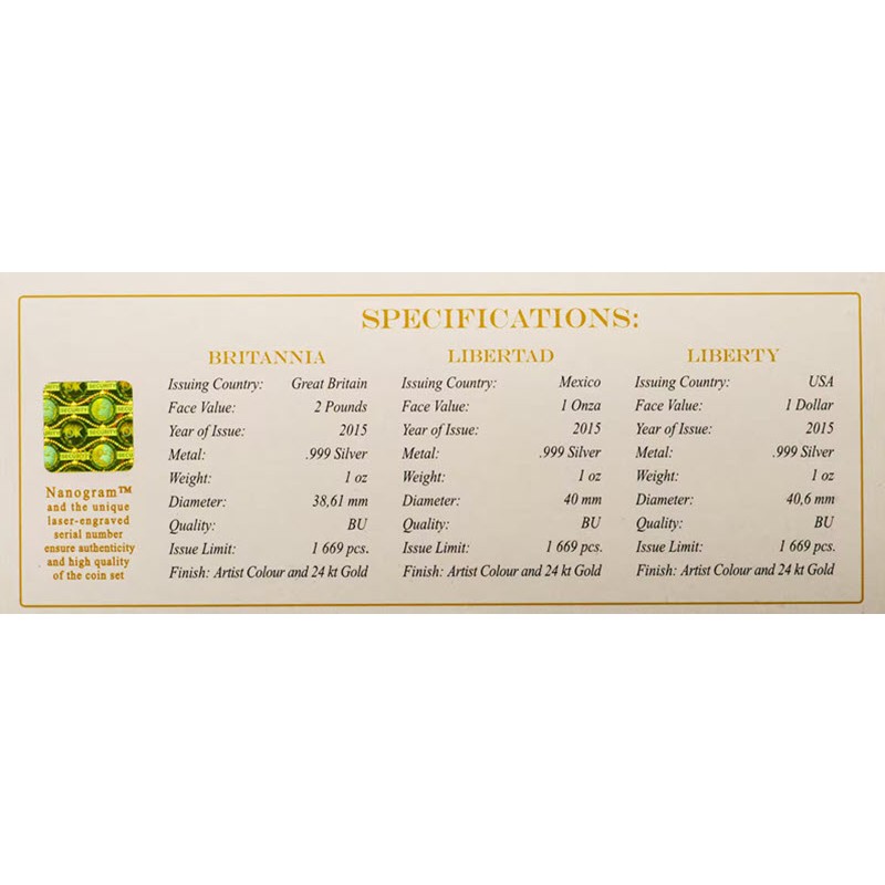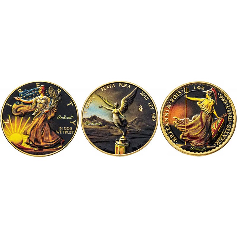 В этот удивительный набор входят «Британия», американская «Шагающая Свобода» и мексиканский «Либертад» с цветовыми эффектами, вдохновлёнными голландским художником Рембрандтом. У них качество BU, селективная окраска и выборочное золочение. Поставляется в оригинальном футляре с сертификатом подлинности. Тираж: 1699 штук.