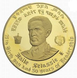 Золотая монета Эфиопии, посвященная 75-летию последнего императора Эфиопии - Хайле Селассие и его 50-летнему юбилею пребывания у власти.