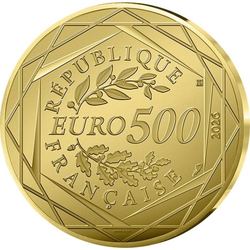 На аверсе изображен символ евро из надписи и ветвей дуба и оливки. Надпись: RÉPUBLIQUE FRANÇAISE EURO 500 (страна-эмитент, номинал). Справа от названия страны монограмма дизайнера JJ (Joaquin Jimenez) и монограмма Парижского монетного двора. Справа у канта: 2026 (год чеканки).