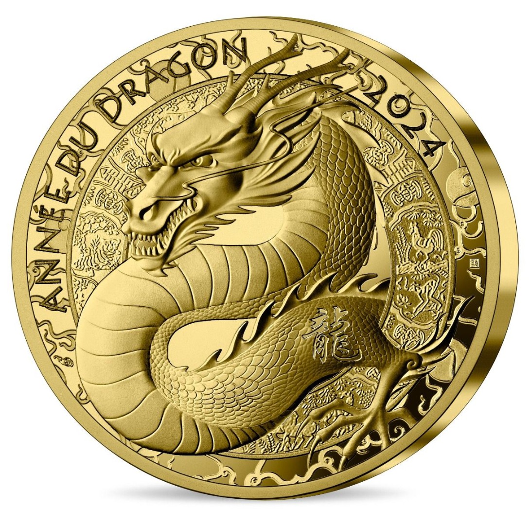 окруженный кругом с традиционными китайскими мотивами, в центре монеты изображен дракон. Он проходит сквозь монету через дверь, изображенную на реверсе. Мифическое существо изображено в традиционном облике дракона в китайской иконографии. Идеограмма дракона появляется с правой стороны. Надпись: "2024 ANNÉE DU DRAGON" выгравирована по верхнему краю монеты.