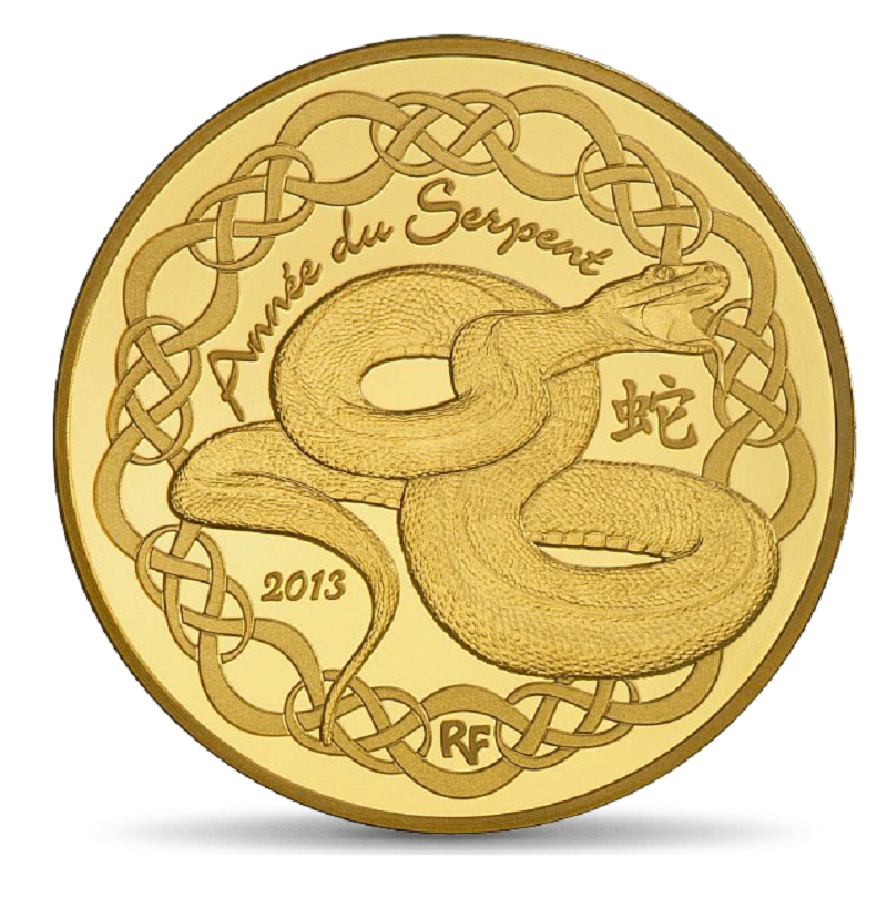 Внутренняя часть монеты представляет собой змею, окруженную надписями «Année du serpent» и «2013», год выпуска и китайские иероглифы. Вокруг фриз рядом со свитком. Змея — шестой знак китайского зодиака, год Водяной Змеи.