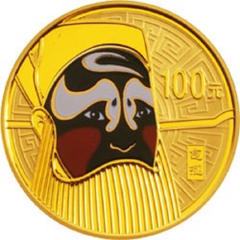 Золотая монета Китая, посвященная маскам Пекинской Оперы. Пекинская опера считается национальным достоянием с более чем 200-летней историей. Она считается самой значительной из всех оперных компаний Китая и играет большую роль в китайской культуре. Красочные маски, вдохновленные древними церемониями и религиозными символами, создаются актерами, а цвета представляют личность и судьбу персонажа.