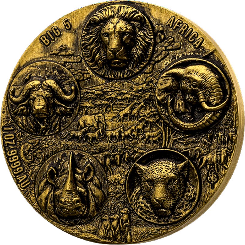 На реверсе на фоне африканской природы по периметру изображены все пять животных из серии: лев, слон, леопард, носорог и буйвол. Вверху вдоль канта надпись: BIG 5 AFRICA (серия), слева: 1oz .9999 Gold (вес и проба золота).