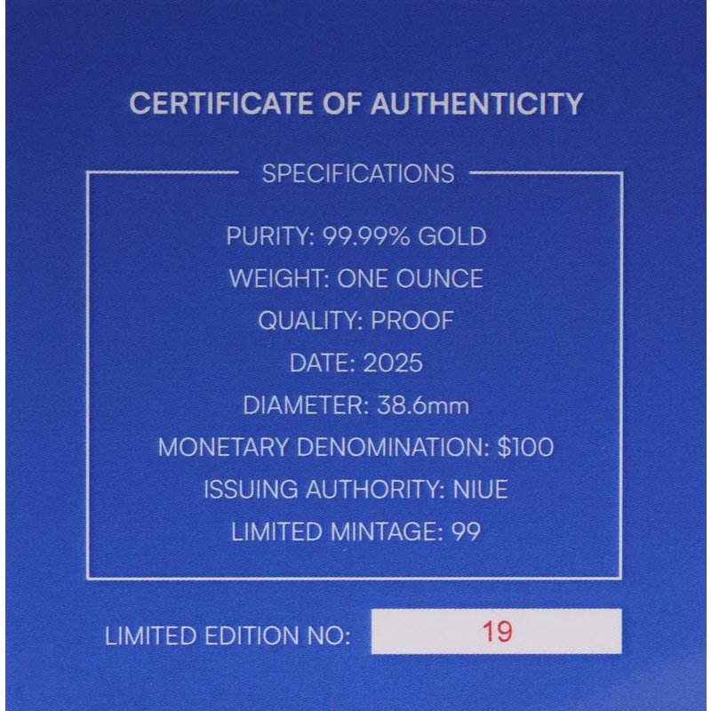 На аверсе изображен Его Величество король Чарльз III. На усечении шеи инициалы дизайнера JC (Jody Clark). Вдоль канта надпись: CHARLES III · NIUE 2025 · 100 DOLLARS · 1oz 9999 GOLD · (Чарльз III, страна-эмитент, год чеканки, номинал, вес и проба золота).