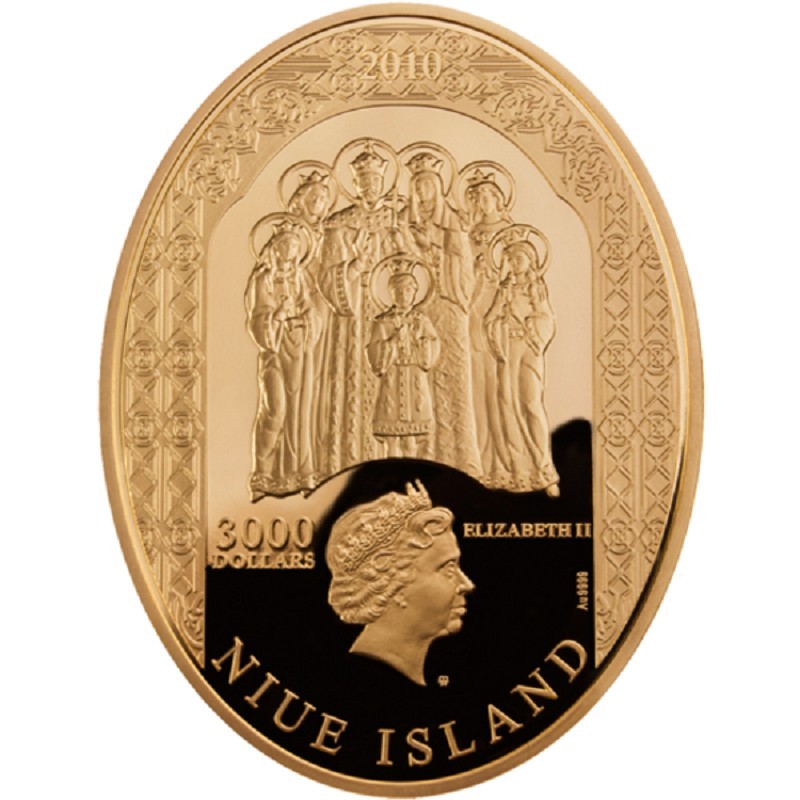 В центре – фрагмент иконы «Царская семья». Вдоль края, вверху и по бокам – орнамент, заимствованный из этой иконы. Под иконой – портрет Её Величества Королевы Елизаветы II и фирменный знак монетного двора (m/w). По бокам – надписи: 3000 DOLLARS (номинал монеты) и ELIZABETH II. Под портретом королевы – наименование страны-эмитента: NIUE ISLAND (Остров Ниуэ). Вверху – год выпуска монеты: 2010.