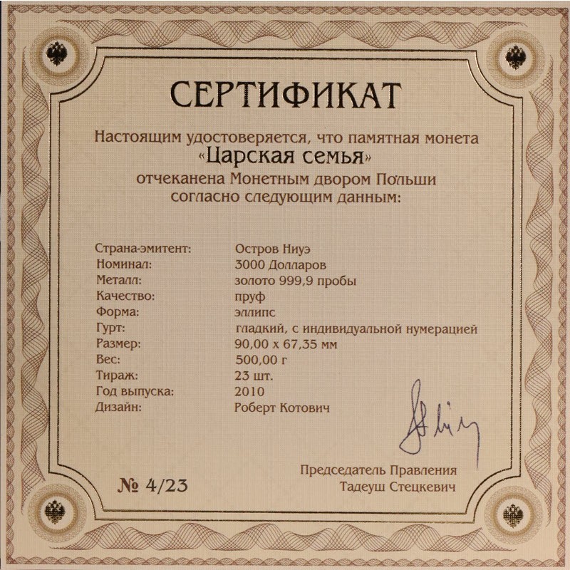 Монета «Царская семья» посвящена последнему российскому императору династии Романовых: Николаю II и его семье. Её тираж ограничен до 23 штук, что объясняется 23-летним сроком правления Николая II.