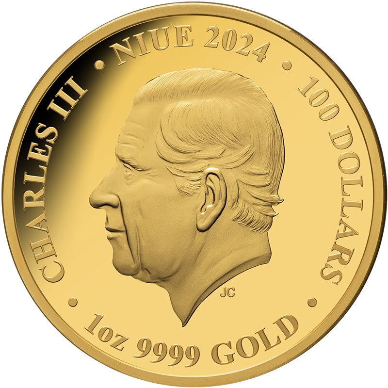 На аверсе изображен Его величество Король Чарльз III. Под портретом инициалы дизайнера JC (Jody Clark). Вдоль канта надпись: CHARLES III · NIUE 2024 · 100 DOLLARS · 1oz 9999 GOLD · (Чарльз III, страна-эмитент, год чеканки, номинал, вес и проба золота).