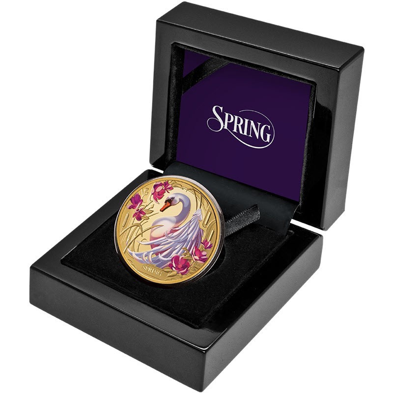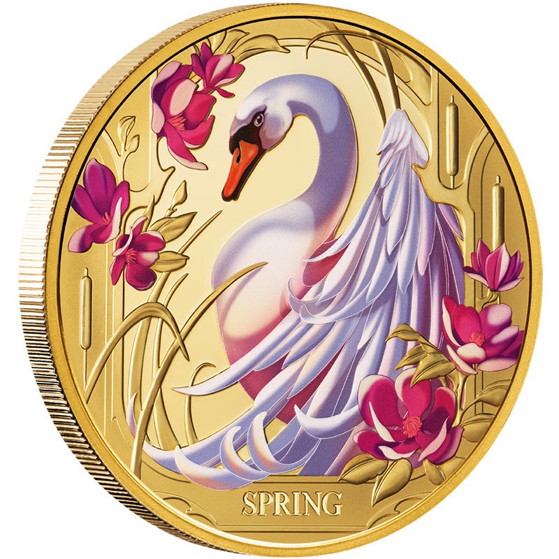 Эта чудесная золотая монета качества пруф весом в 1 унцию – вторая из серии «Времена года» - представляет лебедя, окруженного ярко-розовыми магнолиями. Поставляется в оригинальном футляре с сертификатом подлинности. Тираж: 99 штук.