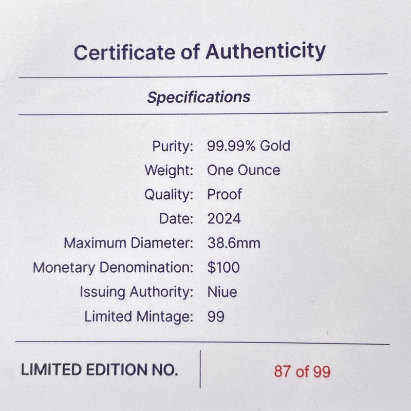 На аверсе изображен Его величество Король Чарльз III работы дизайнера Джуди Кларк (Jody Clark). Вдоль канта надписи: CHARLES III · NIUE 2024 · 100 DOLLARS · 1OZ 9999 GOLD · (Чарльз III, страна-эмитент, год чеканки, номинал, вес и проба золота).