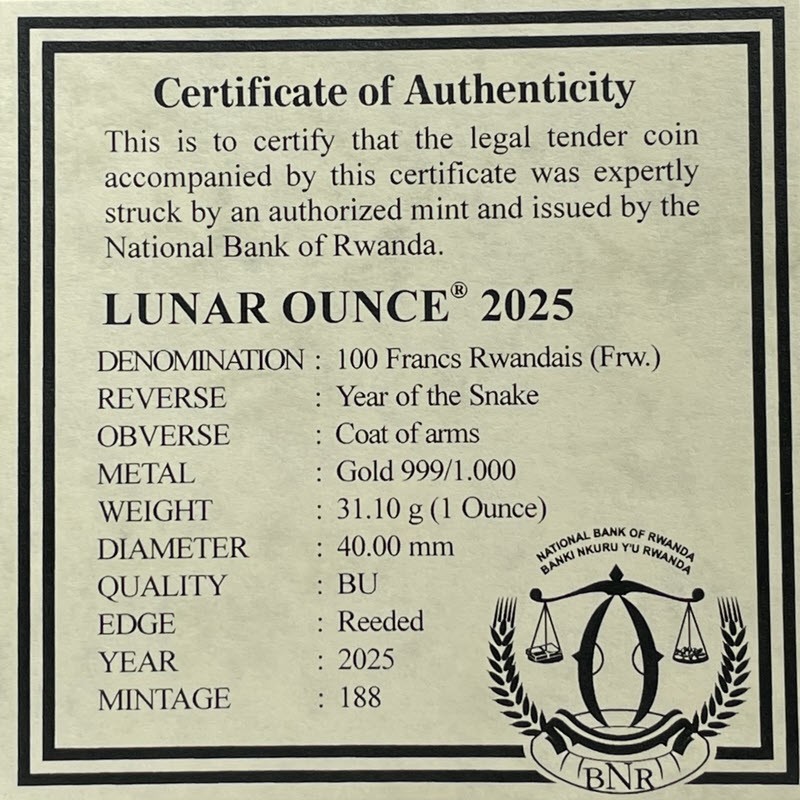 Золотая монета Руанды "Год Змеи" 2025 г.в., 31.1 г чистого золота (проба 999)