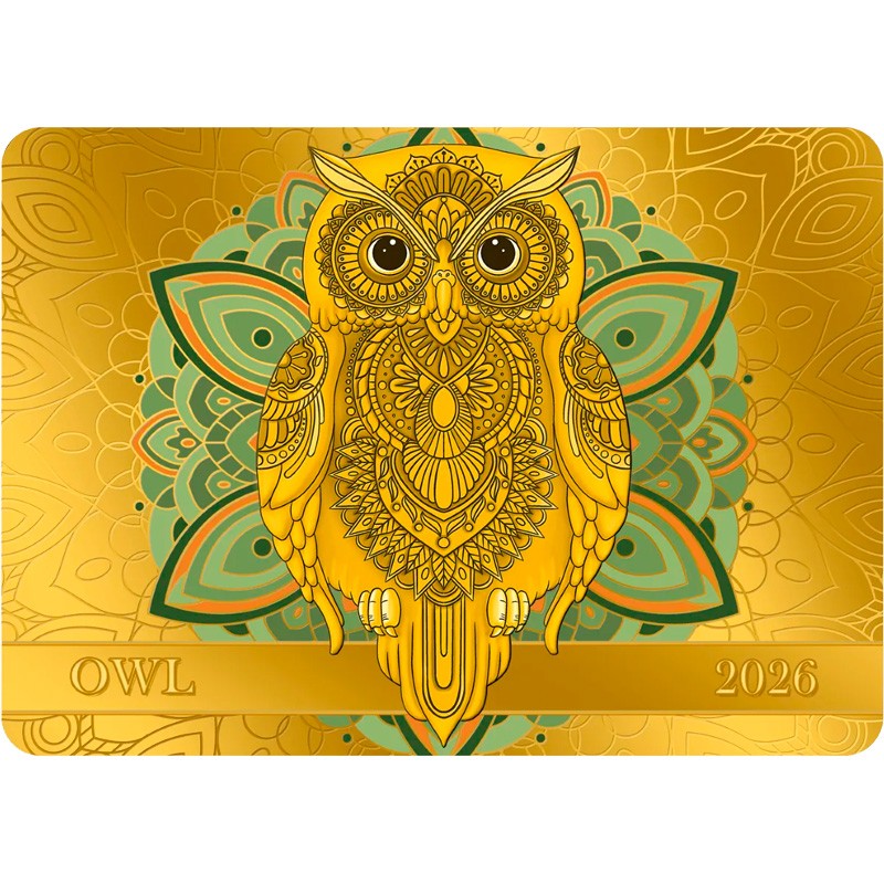 На реверсе изображена сова в ярком стиле мандалы. Слева внизу надпись – OWL (сова), справа – 2026 (год чеканки).