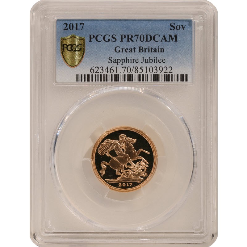 Золотая монета Великобритании "Соверен Елизаветы II. Платиновая свадьба" 2017 г.в. в слабе PCGS PR70, 7.32 г чистого золота (проба 917)