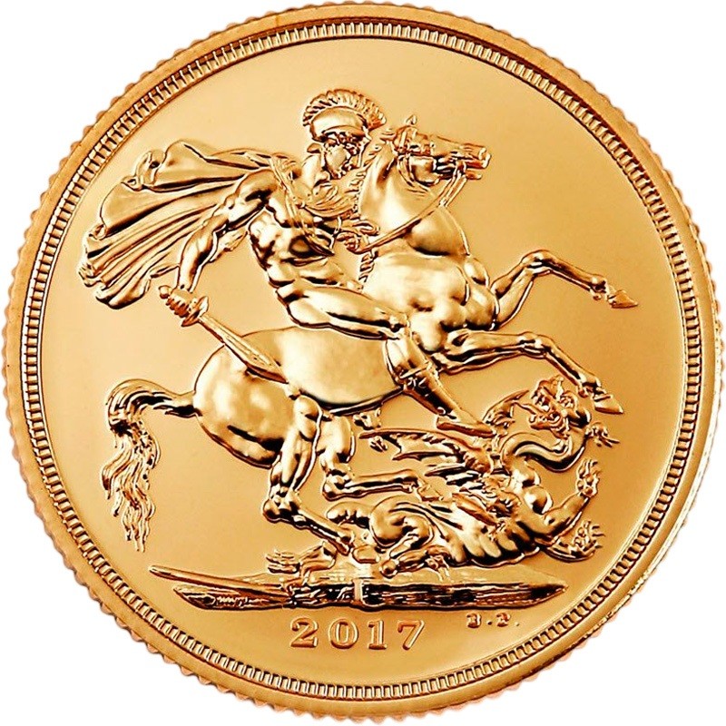На реверсе классическое изображение Святого Георгия и дракона от Бенедетто Пиструччи. Внизу справа инициалы дизайнера Бенедетто Пиструччи: B.P. (Benedetto Pistrucci), по центру: 2017 (год чеканки).