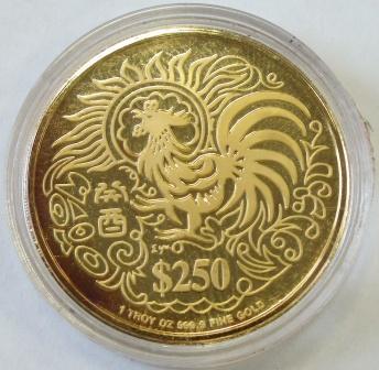 На реверсе золотой монеты - изображение петуха, номинал - 250 сингапурских долларов, вес и проба золота в монете (1 тройская унция - 31,1 г золота 9999 пробы).