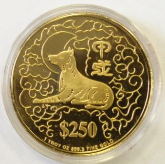 На реверсе золотой монеты - изображение собаки, номинал - 250 сингапурских долларов, вес и проба золота в монете (1 тройская унция - 31,1 г золота 9999 пробы).