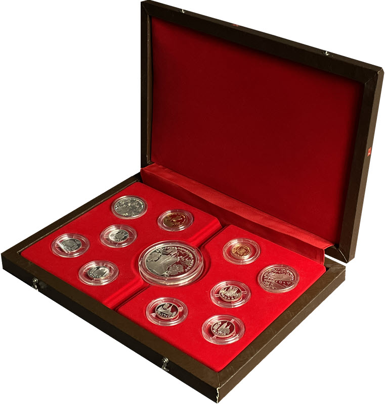 Полный набор из 2-х золотых и 9-ти серебряных монет Банка России из серии «850-летие основания Москвы» 1997 года выпуска качества пруф от монетных дворов Москвы и Санкт-Петербурга. Поставляется в оригинальном футляре.