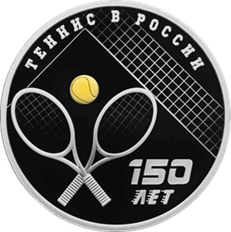 На реверсе изображены две скрещенные ракетки и теннисный мяч с выборочным золочением на фоне сетки. Вдоль канта надпись: ТЕННИС В РОССИИ 150 ЛЕТ.
