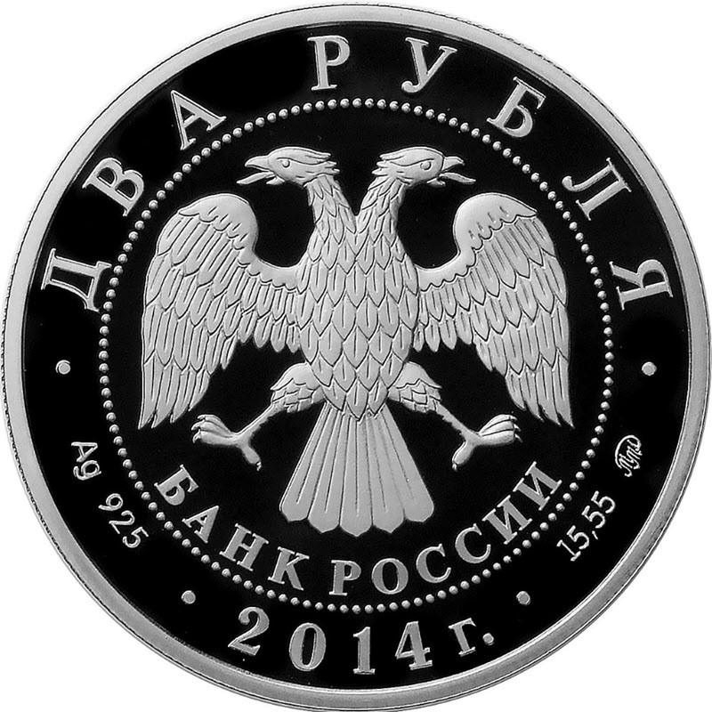 На аверсе изображена эмблема Банка России (двуглавый орёл с опущенными крыльями). Под ним надпись: БАНК РОССИИ. Вдоль канта надпись: ДВА РУБЛЯ • Ag 925 • 2014 г. • 15,55 ММД • (номинал, вес и проба серебра, год чеканки, монограмма московского монетного двора).