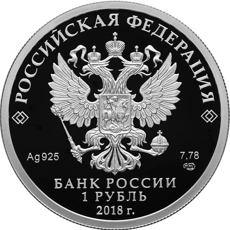 На аверсе рельефное изображение Государственного Герба Российской Федерации. Над ним вдоль канта надпись: РОССИЙСКАЯ ФЕДЕРАЦИЯ. Герб разделяет надпись: Ag 925 7,78 СПМД (вес и проба серебра, знак монетного двора). Внизу надпись в три строки: БАНК РОССИИ 1 РУБЛЬ 2018 г. (банк, номинал, год чеканки).