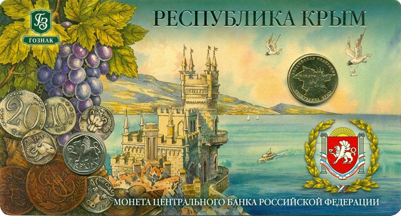 Блистер с монетой и жетоном 2014 г. «Республика Крым» посвящен её вхождению в состав Российской Федерации. У них качество анциркулейтед. Тираж: 2000 штук.