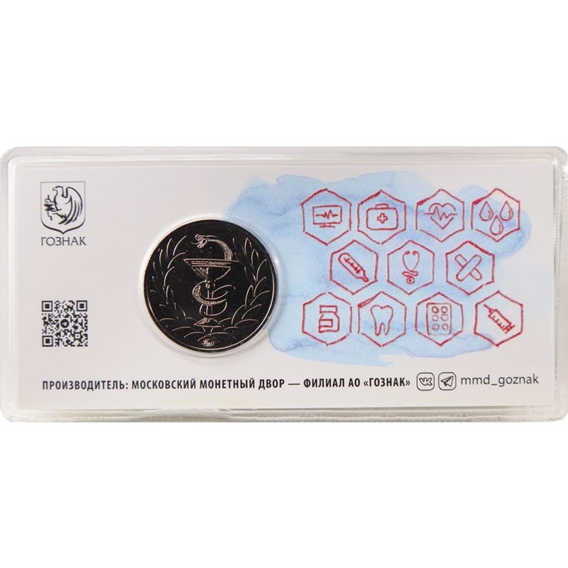 Российский медно-никелевый жетон 2025 года от ММД Гознак посвящен медицинским работникам. У него качество анциркулейтед и селективная окраска. Поставляется в блистере размером 117 х 57 мм. Тираж: 5000 штук.